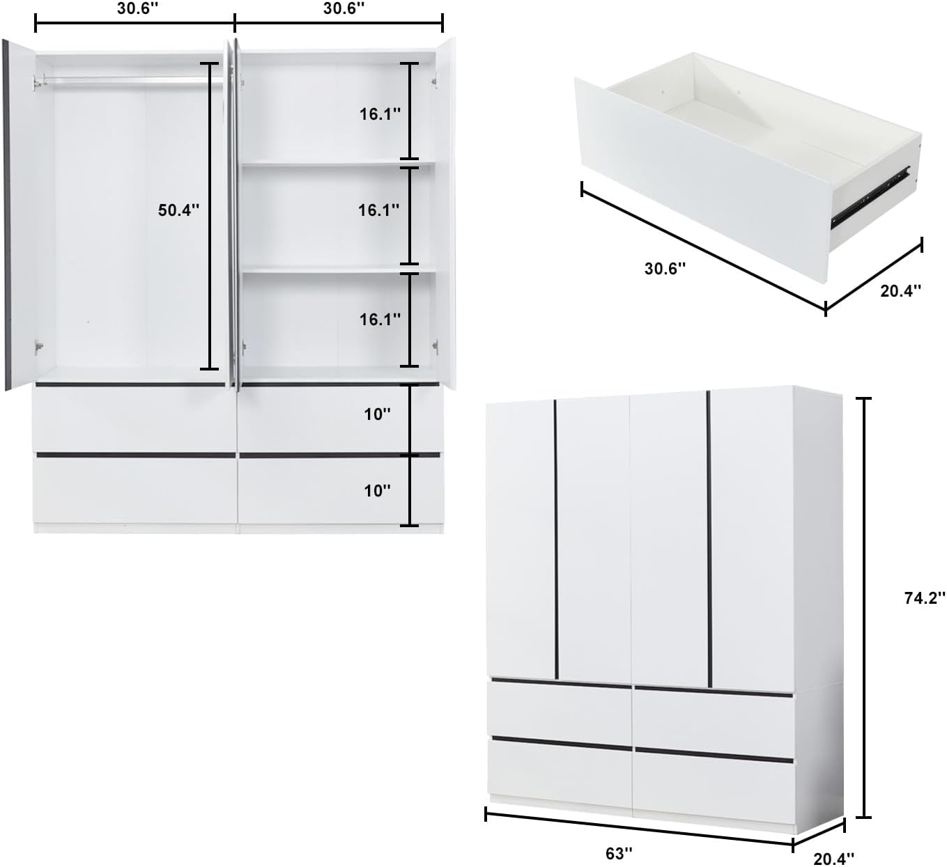 - 【Ample Storage Space】 Our 4-door armoire wardrobe closet comes with 2 drawers, providing you with plenty of storage space.This closet storage rack cabinet will provide convenient and seamless storage anywhere in your home. Drawers with sliders and handles are smooth to pull out and push in, easy to find your clothes.