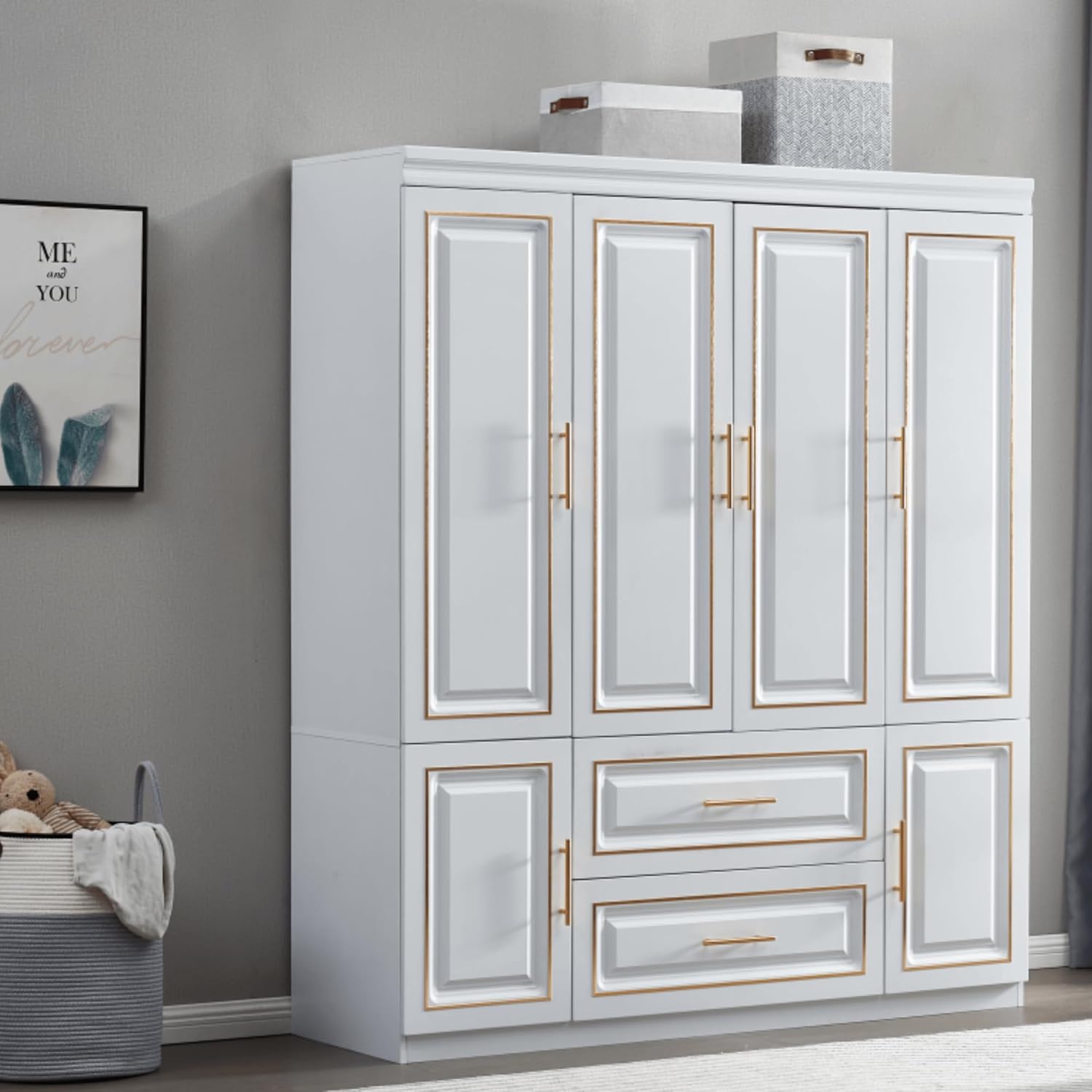 74″ H Wardrobe Cabinet,Wardrobe Closet with 4 Doors, Armoire Wardrobe Closet with Storage Drawers, Clothing Rod and Shelves, Bedroom Armoires with Gold Decorative Border, Armoire