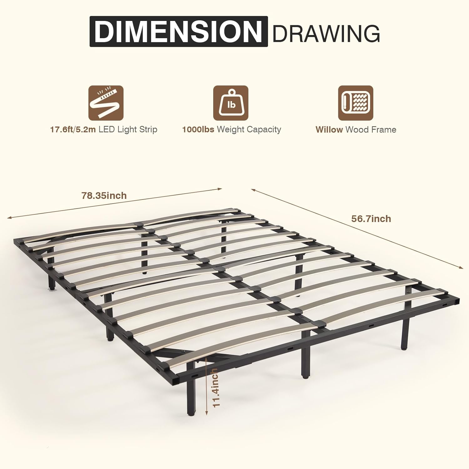 - 【Strong & Steady with Poplar Wood Slats】Built to last! The heavy-duty metal frame and poplar wood slats support up to 1000 lbs and keep your mattress from sagging. No box spring needed—just place your mattress directly on the frame for a sturdy, quiet sleep experience