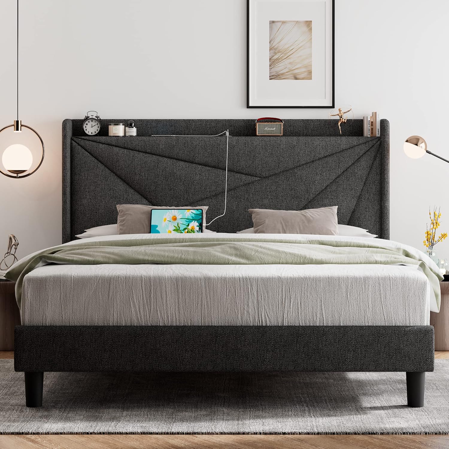 Queen Bed Frame with Type-C & USB Ports, Upholstered Platform Bed Frame with Wingback Storage Headboard, Solid Wood Slats Support, No Box Spring Needed, Noise-Free, Dark Gray